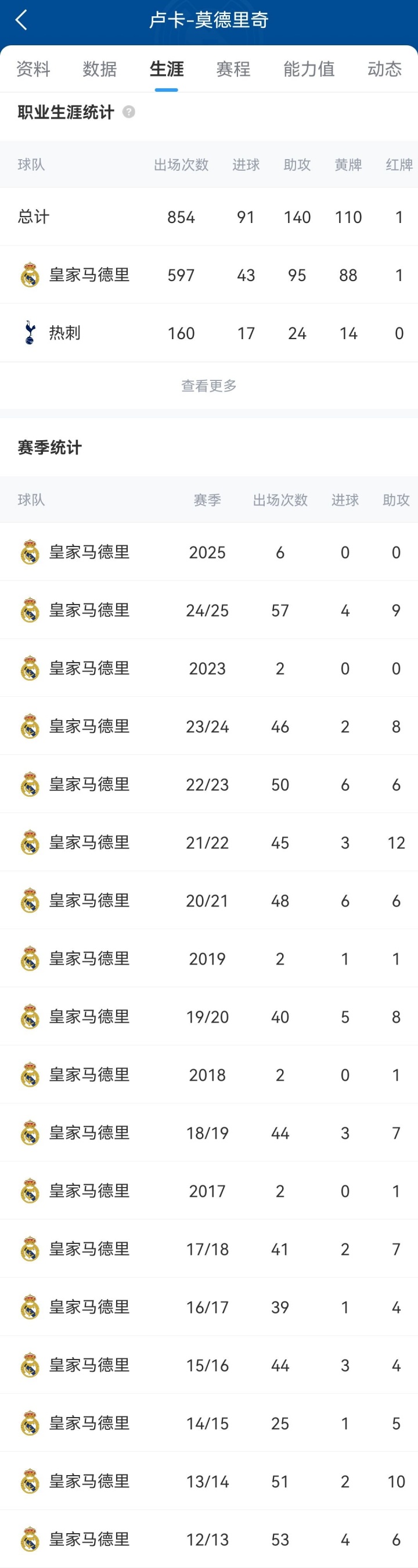 莫德里克(Modric)于2012年加入了皇家馬德里(Real Madrid)。他在13年內(nèi)進(jìn)行了597場比賽,打進(jìn)43球并協(xié)助95次比賽,幫助球隊贏得28冠軍獎杯:6個冠軍聯(lián)賽,6個俱樂部世界杯,5個歐洲超級杯,4個La Liga,2杯杯,2杯德爾·埃爾·雷伊和5個西班牙超級杯。